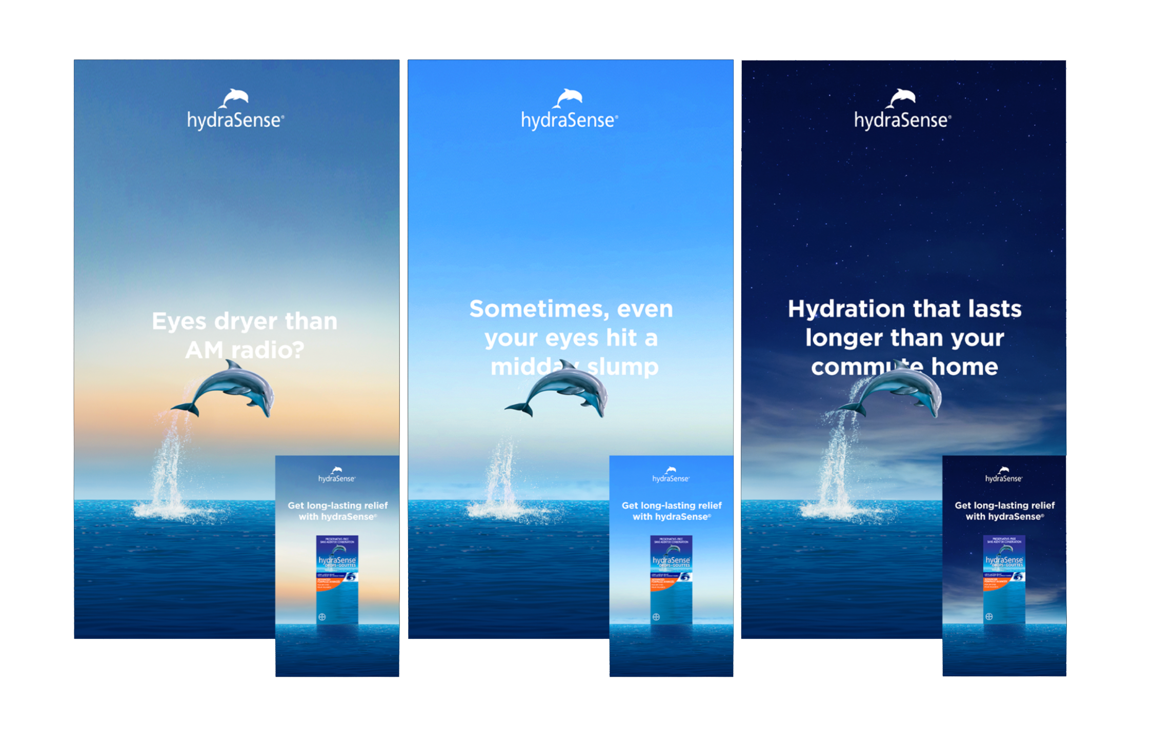 Subtle changes to the hydraSense vista will reflect the time of day—morning, afternoon, and night—creating a dynamic skyline. The copy will remain on frame as a dolphin animates, jumping near it. Finally, the product pack appears on screen alongside the pack name and claim.